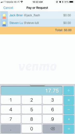 Nearly all of our interviewees was that many people either did not know about or use the calculator function within the Venmo app. Instead they exited the app to use another calculator when finalizing the total amount.